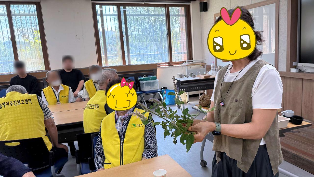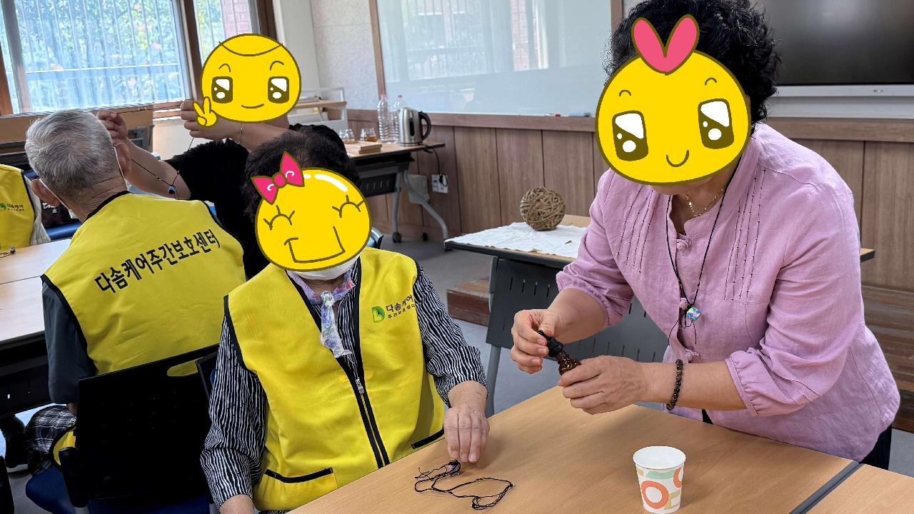 지난 9월 5일 다솜케어주간보호센터에서는 동신대학교에서 진행하는 숲체험 프로그램에 참여했습니다. 8월 한 달간 방학을 마친 후 다시 시작된 첫 수업으로, 어르신들께서 오랜만의 외부활동에 들뜬 마음으로 함께하셨습니다. 이번 프로그램에서는 - 식물 이름을 맞히는 식물 퀴즈 게임 - 가을을 상징하는 빨간 고추잠자리 모형을 막대에 올려보는 활동 - 향기로운 아로마 오일 목걸이 방향제 만들기 체험 등이 진행되었습니다. 특히 방아잎을 보고 한 어르신께서 "추어탕에 넣으면 맛이 아주 좋다"고 말씀하시자 다른 어르신들께서 고개를 끄덕이며 웃는 등 분위기가 더욱 활기차고 즐거워졌습니다. 어르신들은 각 활동을 통해 자연과 교감하고 오감을 활용하며 즐거운 시간을 보내셨습니다. 다솜케어주간보호센터는 어르신들의 건강한 여가와 신체활동을 위해 다양한 외부활동을 꾸준히 마련하고 있습니다. 센터 프로그램에 대해 궁금하시거나 이용 상담 및 방문을 원하시는 분들은 언제든 편하게 문의해 주세요^^