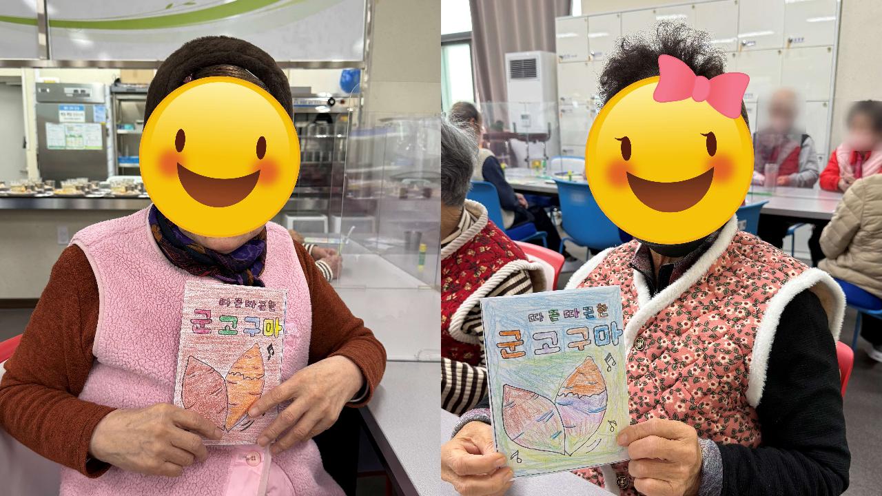 다솜케어주간보호센터에서는 군고구마 만들기 활동을 진행했습니다. 어르신들께서 완성된 군고구마 그림에 귀마개까지 착용하시고 즐겁게 사진촬영하셨답니다^^ 이날 간식으로는 고구마가 들어간 야채튀김과 한과, 달달한 식혜가 제공되어 만들기 활동과 간식이 자연스럽게 이어진 하루게 되었습니다^^ ☎ 센터 이용 및 상담 언제든지 편하게 문의해 주세요. 어르신의 상황에 맞춰 친절하게 안내해드리겠습니다.