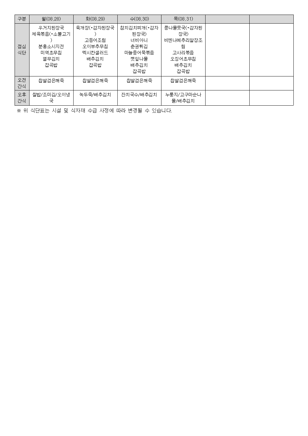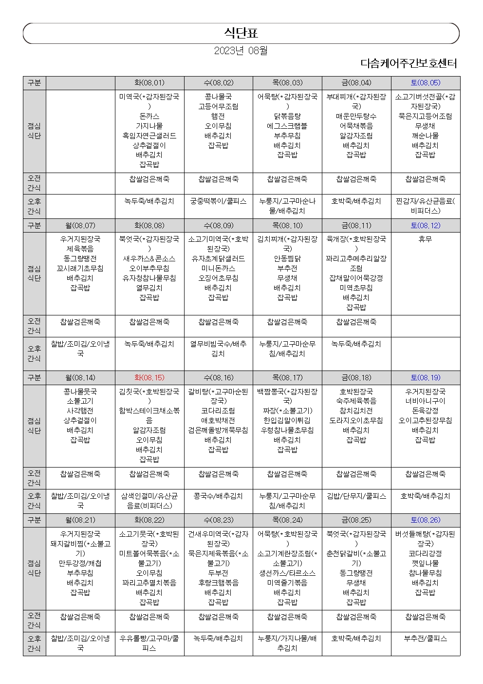 2023년 8월 식단표