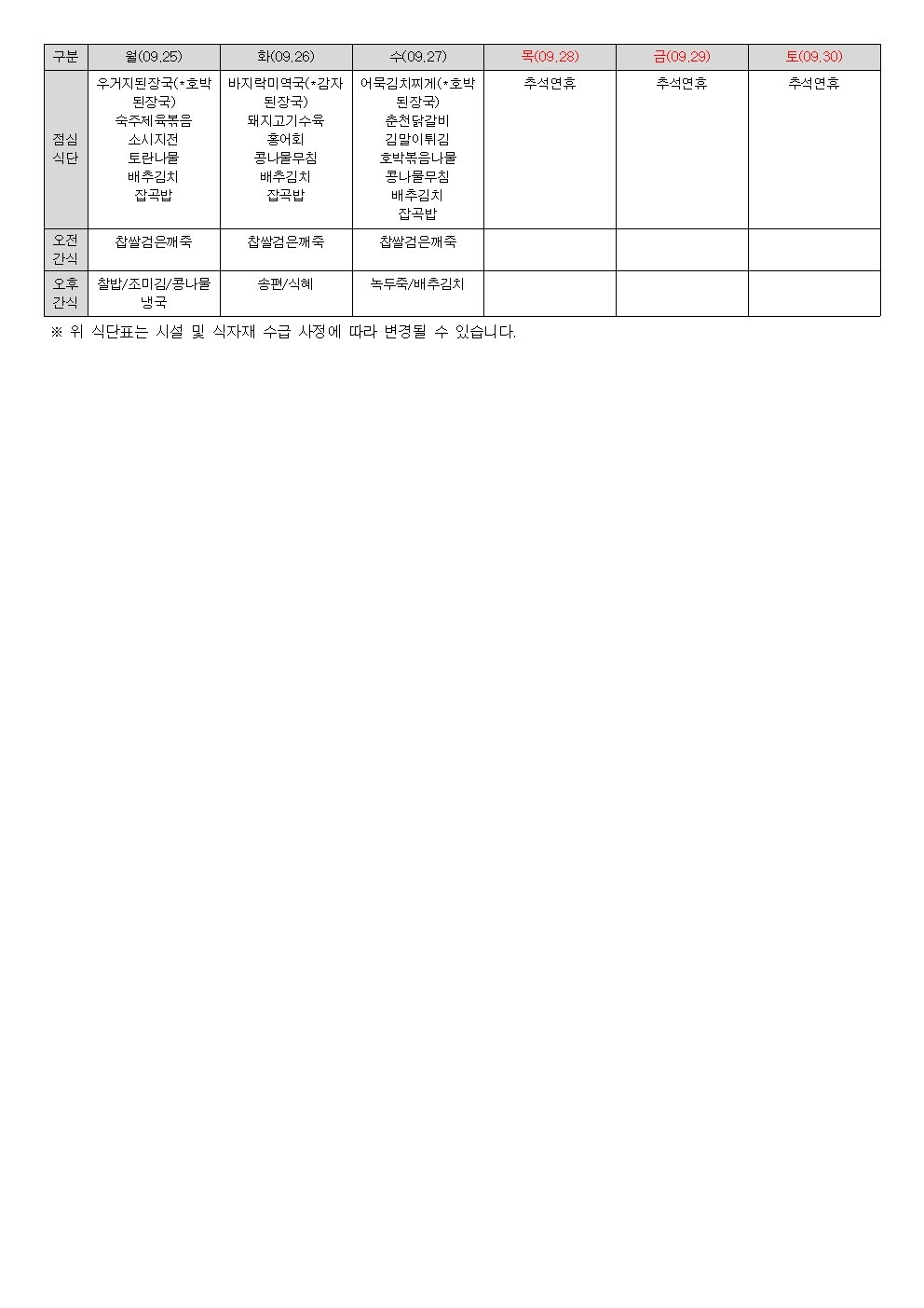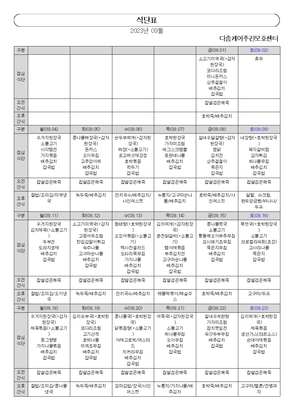 2023년 9월 식단표